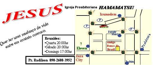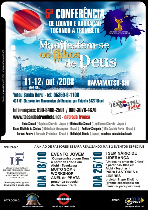 Seikiti _ Graça e Paz, estou em Hamamatsu-shi, Shizuoka-ken, gostaria de obter o endereço da Igreja para fazer uma visita.13/3/05 www.tocandoatrombeta.net _ 5a.Conferência de Louvor e Adoração Tocando a Trombeta : Manifestem-se os Filhos de Deus ". de 11a12/10/2008 em Hamamatsu-shi . informações 090-8488-2501 Yro Muito obrigado por seu carinho e por sua preocupação com a minha saúde. Eu agradeço de coração! Yro, eu nunca soube que você viveu no Japão. Conte-me um pouco sobre isso. um grande abraço, querido missionário. Wagner Antonio de Araújo - - - = =