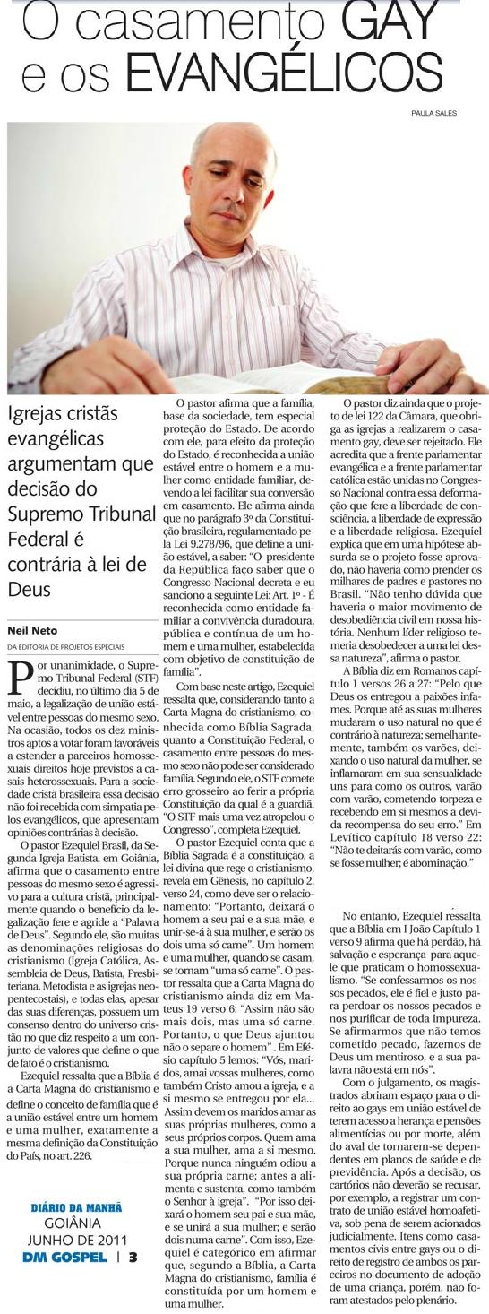 Boa tarde... li rapidamente os debates abaixo... que coisa em!! O assunto é sério e têm pessoas sinceras, inteligentes, realmente preocupadas com isto. Estas pessoas sinceras, são honestas e procuram o real "ser", não somente o "ter" ou "estar" como ensinava brilhantemente o irmão Caio Fábio (quando dizia que somos do Senhor Jesus). Meu medo, isto é, meu coração derrete de preocupações quando percebo nesta linha de raciocínio que o Caio Fábio mostra no artigo abaixo aconselhando uma jovem "gay", que: - ele mostra que tem gente que é e gente que está; é "gay" tudo bem, desde que seja assumido e fiel a um parceiro... Agora, nesta linha de pensamentos, percebam comigo alguns pontos de tensão, verdadeiro choque que pode levar estas pessoas sinceras ao desespero, vejamos, podemos ser: - amantes fieis (ter vários parceiros(as) desde que todos concordem e sejam os únicos), ser homicida desde que matar seja bom (não matar por esporte ou aleatoriamente), ser viciado, desde que não prejudique ninguém e o vício seja parte de minha estrutura biológica, ser algo errado desde que não prejudique ninguém...ser alguém que fazer sexo seguro... As demais opiniões, exemplos e conclusões, de pessoas respeitáveis, mostram pontos de tensão, ora apelando para a letra fria da da lei bíblica e ora apelando para uma determinada moral, e ou até perigosamente, saindo para o "etéreo" num salto sobre um abismo escuro apoiados nas fumaças de pensamentos desconexos... boas pessoas, gente sincera, buscando a verdade que deve realmente existir em algum lugar... 'Nossa luta, não é contra a carne, mas, contra as potestades (autoridades) do maligno nos lugares celestiais (entendo eu ser os pensamentos também)... anulando sofismas (literalmente - pensamentos enganosos)..." Paulo, Novo Testamento. É... vou continuar orando. _ Nilson Franco = = = Roseli
